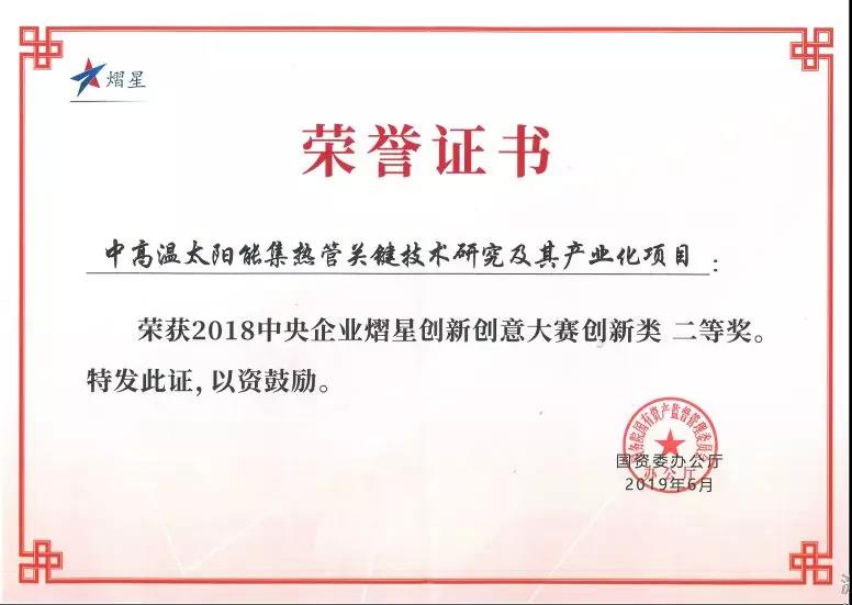 近日,由中國西電集團(tuán)推薦,寶光股份申報(bào)參賽的《中高溫太陽能集熱管的關(guān)鍵技術(shù)研究及其產(chǎn)業(yè)化》獲得2018年中央企業(yè)熠星創(chuàng)新創(chuàng)意大賽二等獎(jiǎng)。